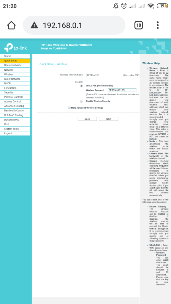 STEP 10 : Masukkan SSID / Wireless Network Name, Security atau password wifi nya (Sesuai Keinginan Kalian). Klik Next untuk langkah selanjutnya.