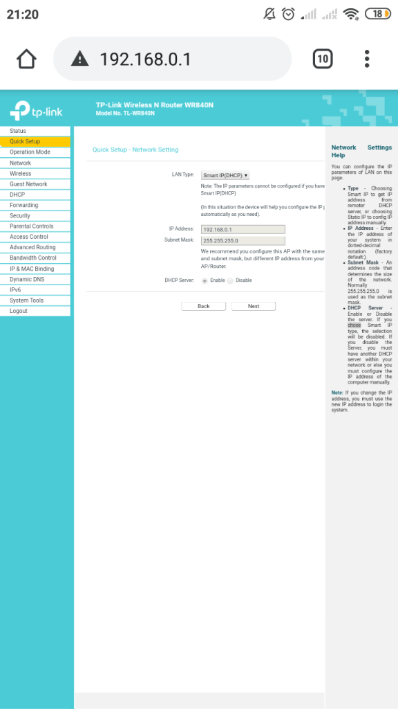 STEP 11 : Ubah LAN Type menjadi DHCP (Smart IP DHCP) dan klik enable DHCP Server. Klik Next untuk langkah selanjutnya