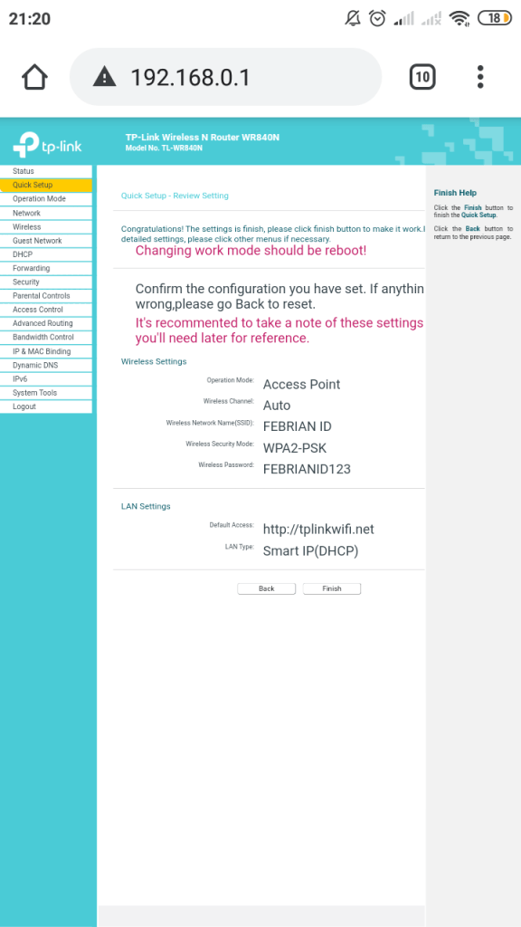 DAN PROSES KOFIGURASI TP-LINK WIRELESS N ROUTER MENJADI ACCESS POINT TELAH SELESAI