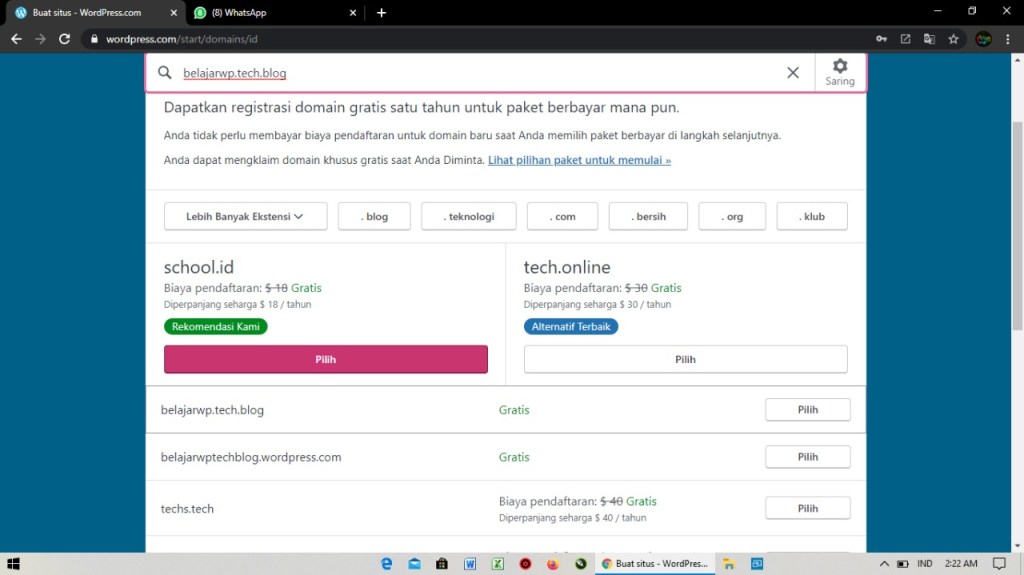 5. Setelah memasukan nama domain yang kalian inginkan lalu scroll sedikit kebawah dan pilih yang bertulisakn Gratis lalu klik Pilih