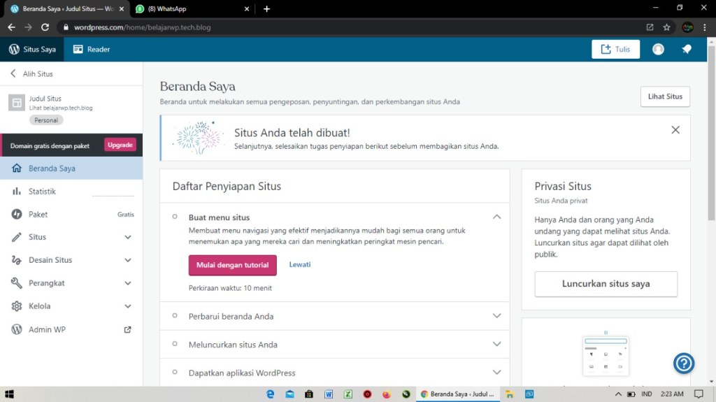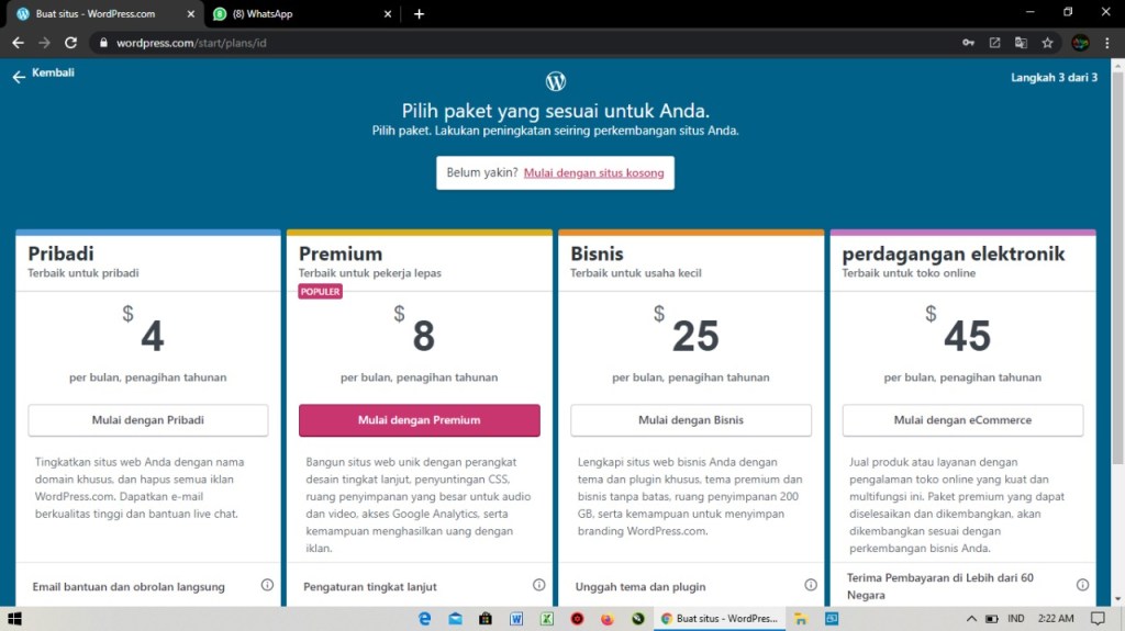 6. Setelah itu kalian akan diarahkan untuk memilih paket yang tersedia. Agar blog yang kalian buat gratis klik saja tulisan yang paling atas Mulai dengan situs kosong.