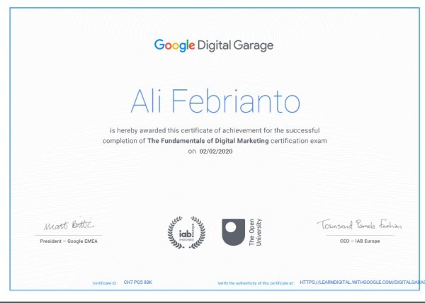 Sertifikat ini cocok untuk menunjang karir anda terutama anda yang berpengalaman maupun sedang belajar Digital Marketing Online dan seorang Blogger. Cocok untuk koleksi sertifikat anda. Untuk pamer hahahaha...